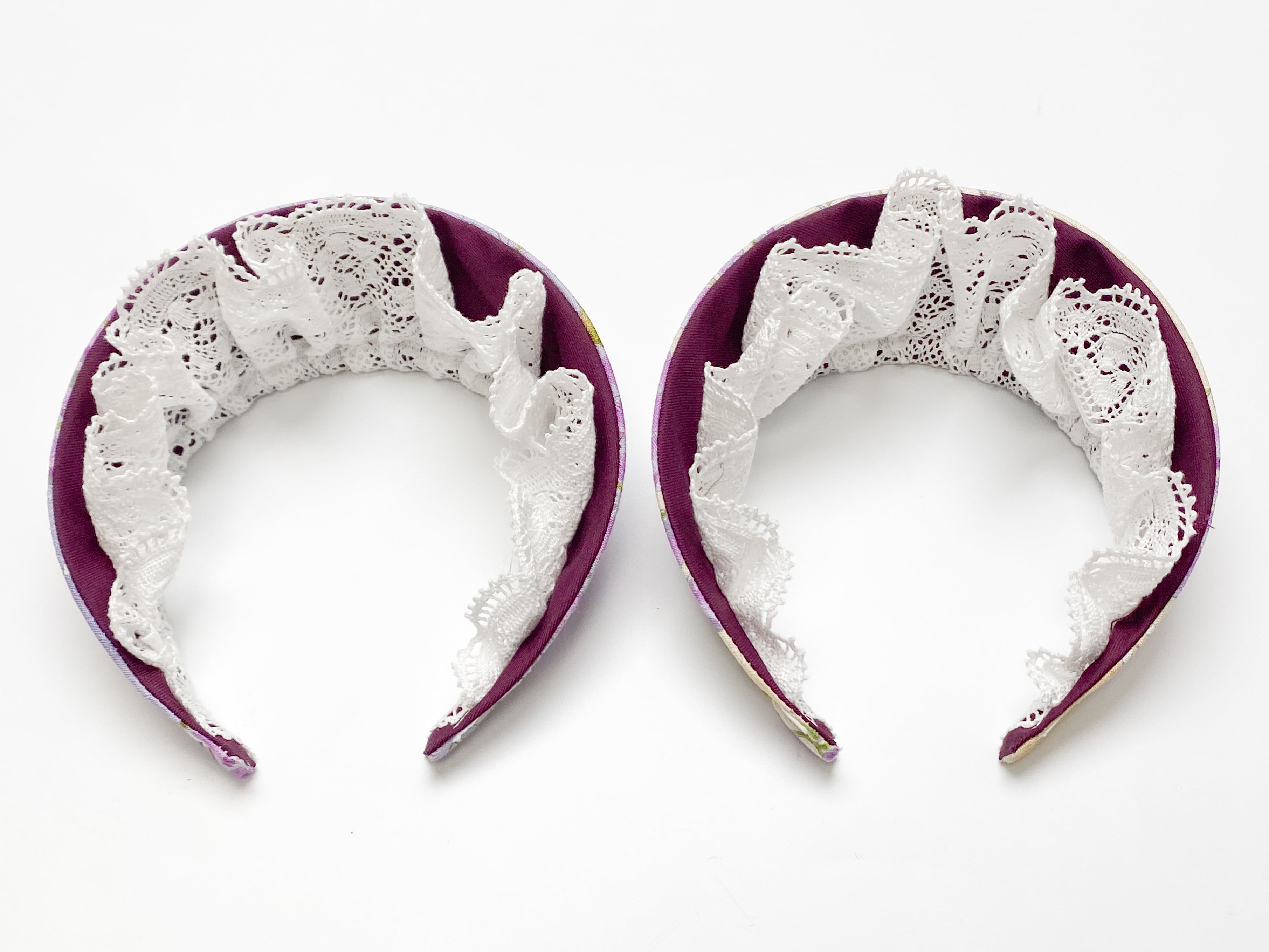 藤の花ココシニクカチューシャは藤の花ワンピースと同じ生地、装飾を使用したココシニクカチューシャです。表裏で生地が異なっており、好みに合わせた着用が可能です。